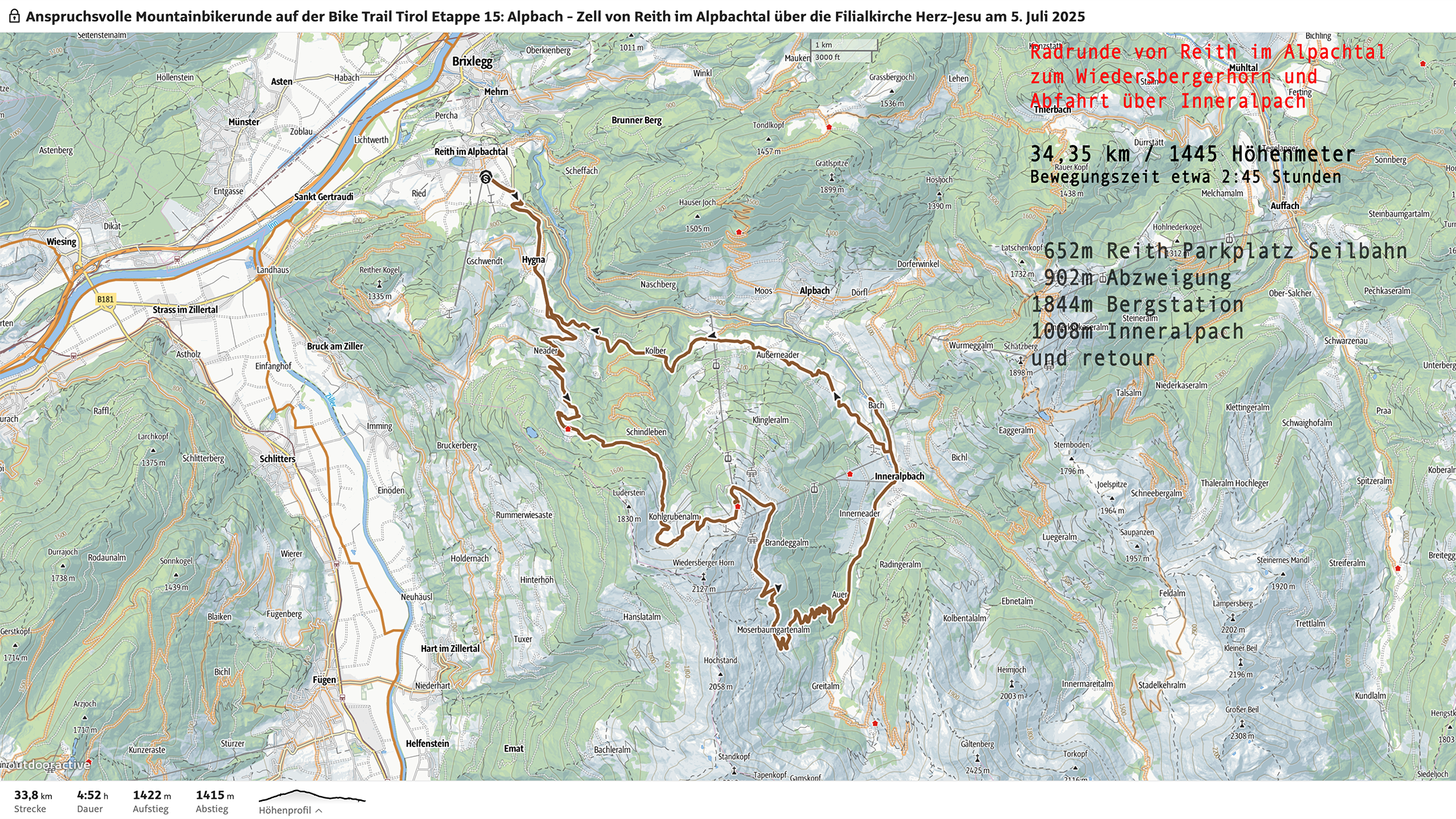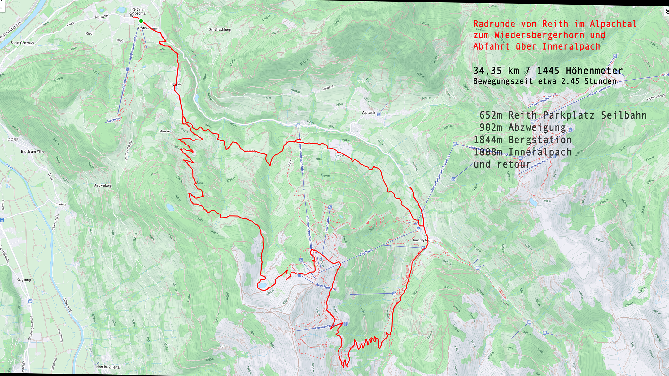 Vom Parkplatz bei der Gondelbahn in Reith hinauf zu Bergstation und auf der anderen Seite hinunter nach Inneralpach. Von dort durch die herrliche Gegend mit den unvergleichlichen Höfen zurück zum Ausgangspunkt, gewürzt mit einem kurzen, fordernden, trailartigen Abschnitt im Graben 🙂