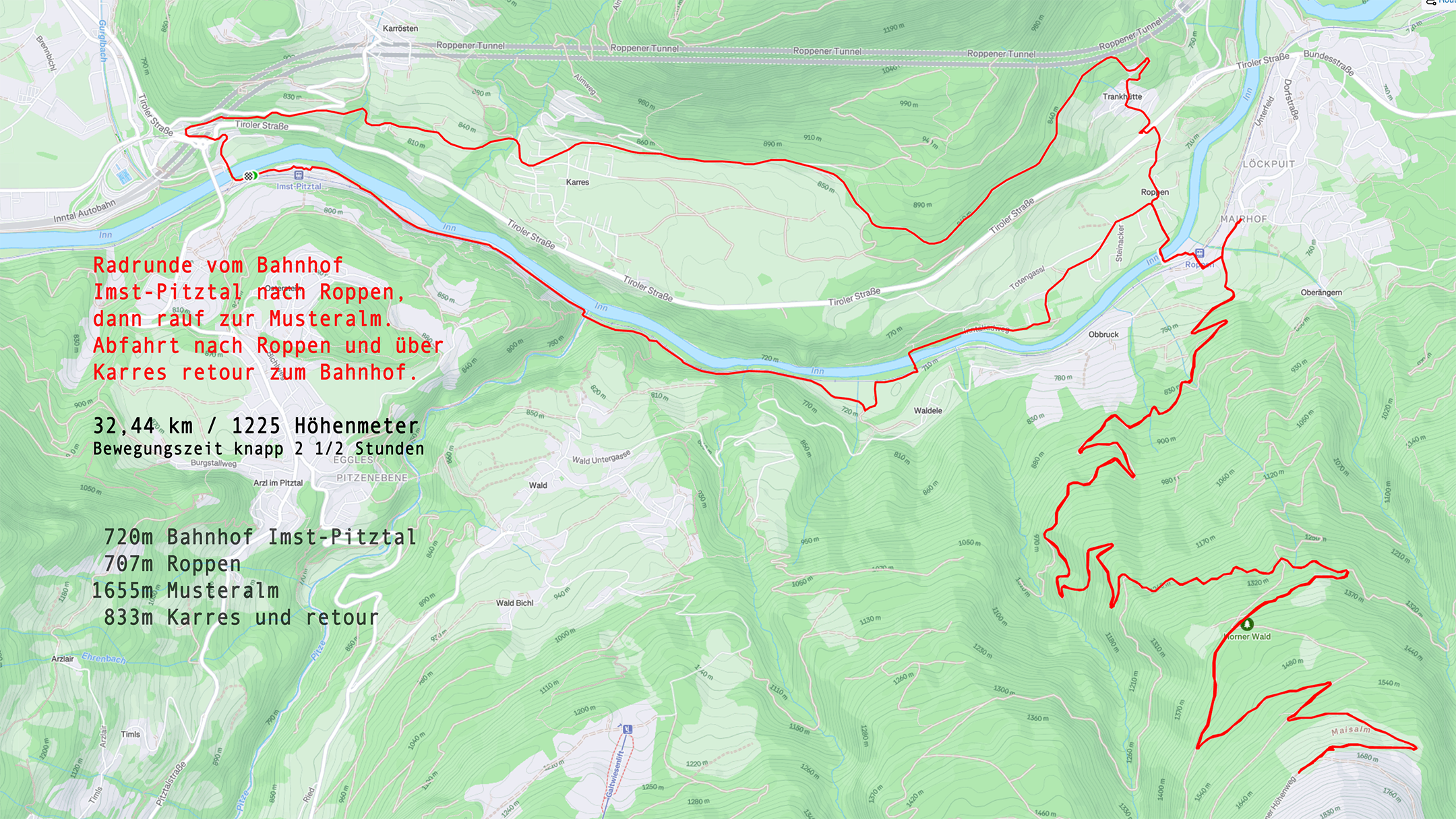 Wir starten am Bahnhof-Imst-Pitztal. Der Bahntrasse entlang nach Roppen und dann hoch zur Maisalm. Am Rückweg nehmen wir eine Variante über Karres …