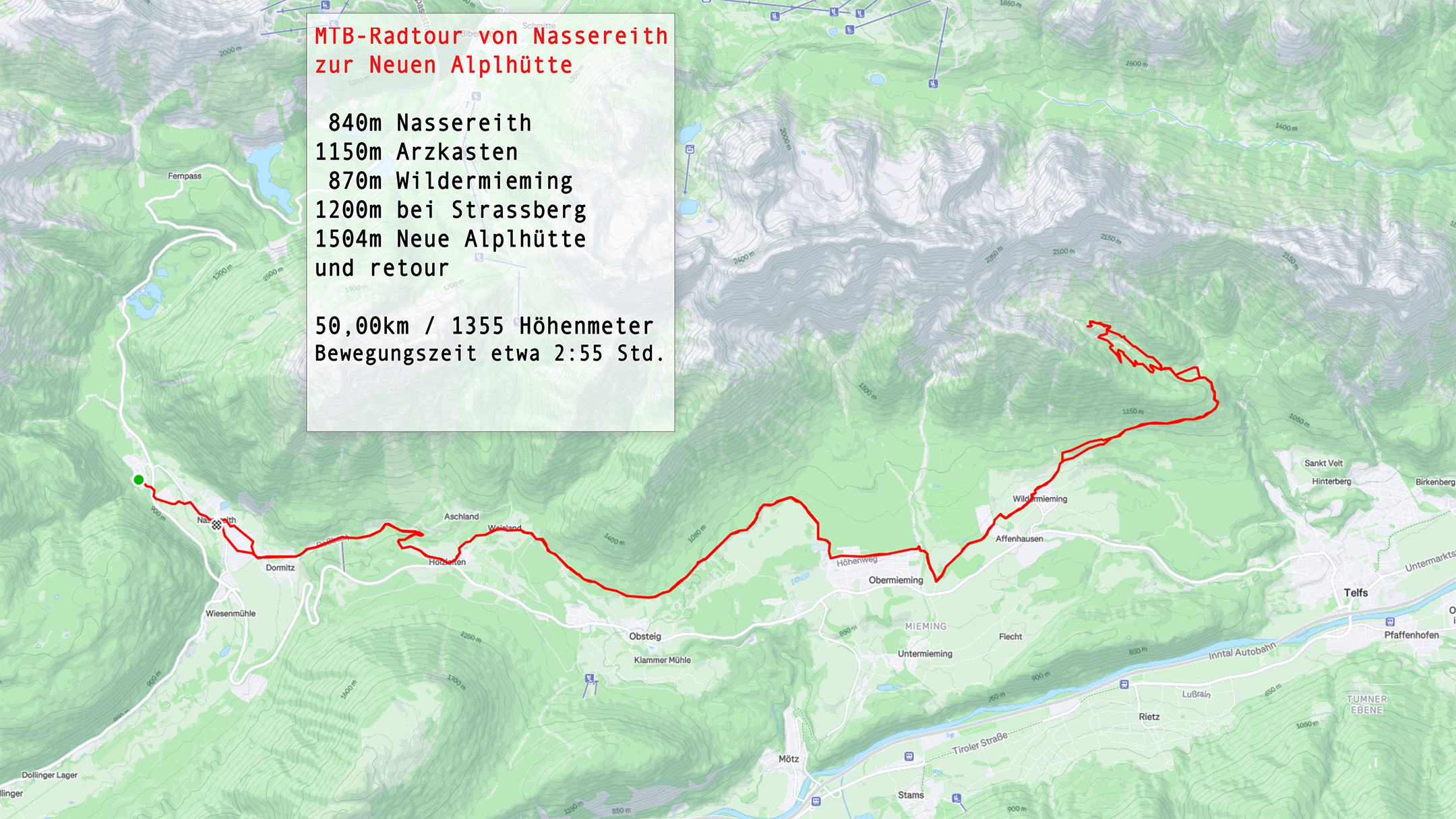 Anfahrt übers Plateau durch tolle Wälder und an blühenden Wiesen vorbei, bis es dann ab Wildermieming erst steil, zuletzt dann richtig fordernd zur Neuen Alplhütte geht. Dort gibt’s immer feinstes Essen und wohlschmeckende Nascherei bei freundlicher Bewirtung!