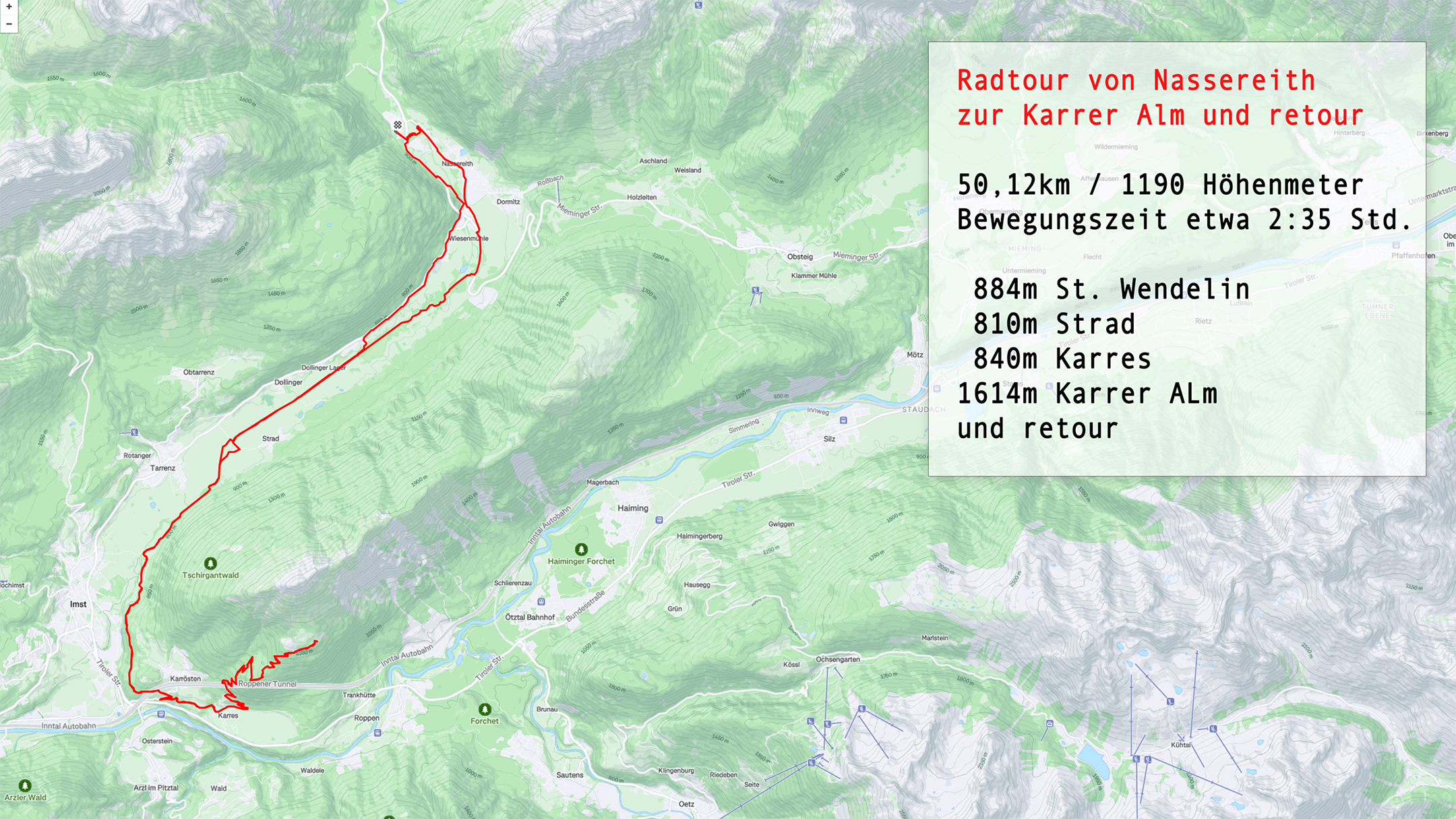 Zum ‚Einrollen‘ bietet sich in Nassereith der neue Trail bei Brunnwald an. Dann fahren wir entspannt durchs Gurgltal und über Karrösten nach Karres. Dort wird’s anfangs steil, dann immer fein auf dem Forstweg bis zur Alm.