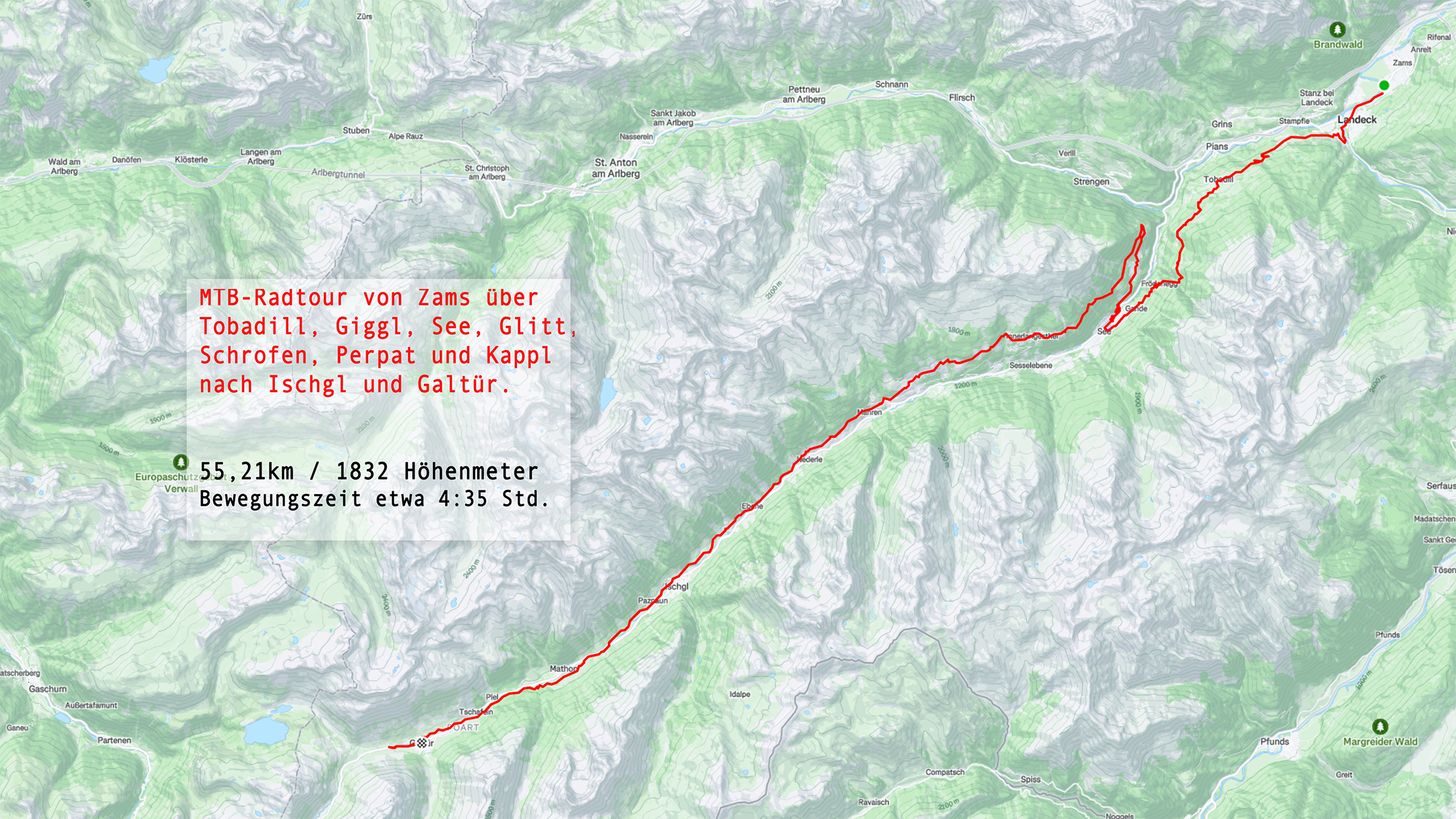 Paznauntal von Tobadill bis Galtür Paznauntal von Zams bis Galtür mit Trail bei Giggl hinunter nach See. Dann über Glitt, Schrofen, Perpat und Kappl nach Ischgl und Galtür. Weil’s dort zu regnen beginnt, nehmen wir den Bus retour nach Landeck.