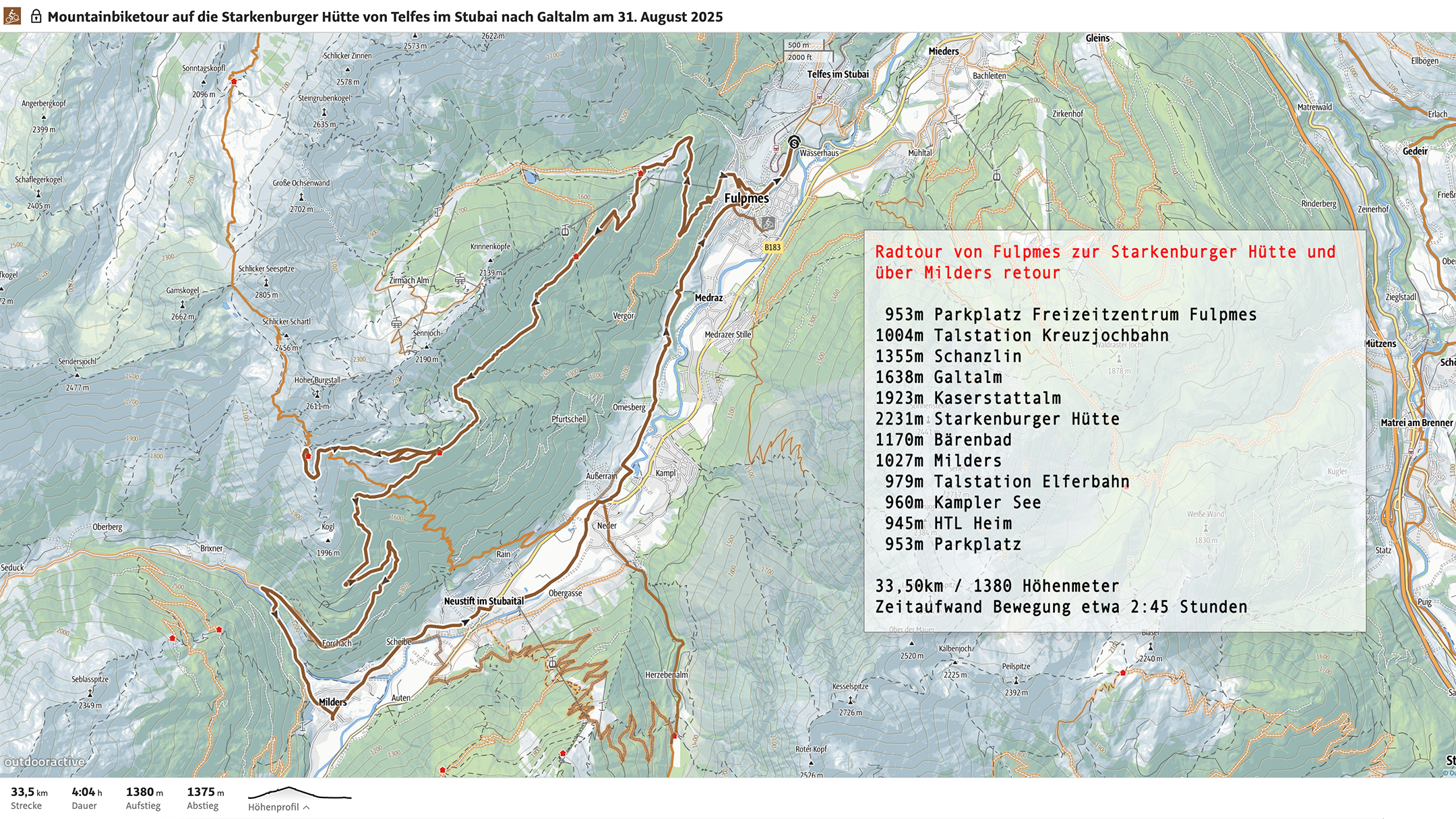 Wir starten vom Parkplatz beim Freizeitzentrum / Hallenbad Fulpmes zur Talstation der Gondelbahn. Ziemlich steil auf dem Forstweg nach Schanzlin und weiter zur Galtalm (1638m). Der Weg von dort zur Kaserstattalm wird derzeit saniert und ist recht grobschottrig. Am Abschnitt Kaserstattalm zur Starkenburger Hütte begleitet uns das herrliche Panorama der stolzen Dreitausender und all der anderen Spitzen.