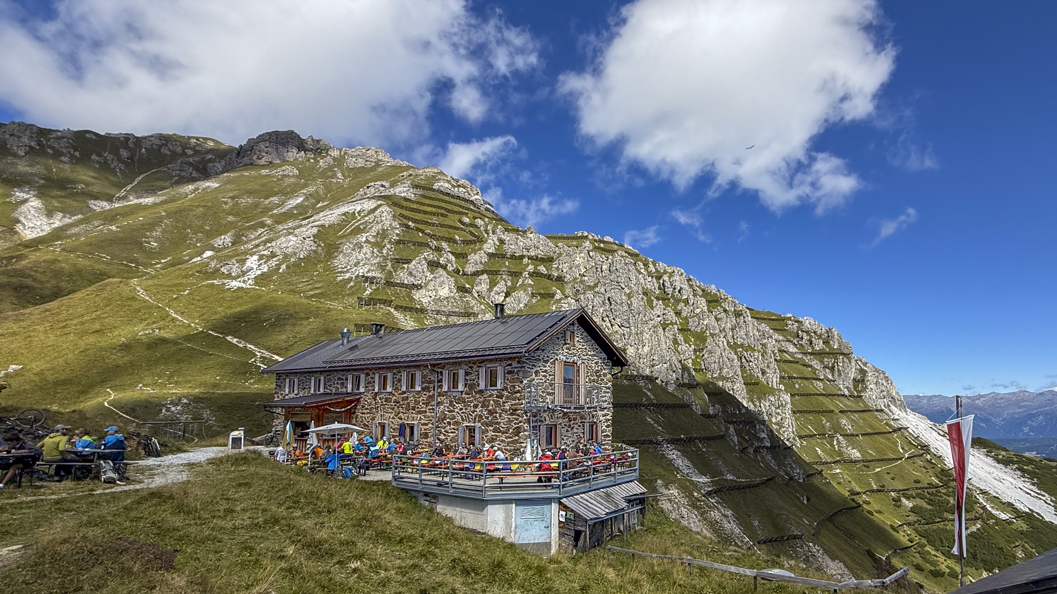 Das herrliche Frühherbstwetter hat viele Wanderer und Radfahrer zu der toll gelegen Hütte kommen lassen. Buntes Treiben. Die freundliche Bedienung serviert uns feine Köstlichkeiten.