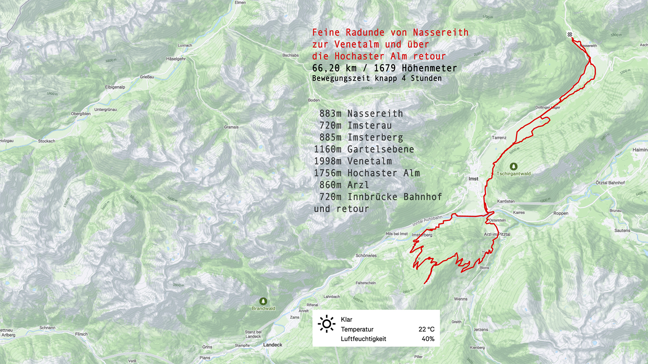 Von Nassereith znächst durchs Gurgltal bis Imst. Am Radweg von Brennbichl bis Imsterau. Au der asphalterten Strasse nach Imsterberg und weiter bis zur Gartelsebene. Von da gibt’s zwei Varianten zur Alm – wir nehmen heute die vorerst asphaltierte Strasse, später die letzten paar Höhenmeter am Forstweg bis zu den ein ladenden Tischen und Bänken vor der Venetalm.